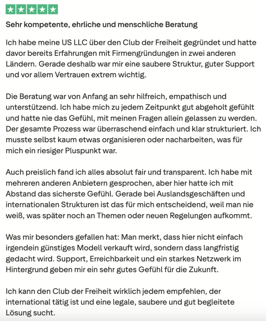 Du erhältst nach spätestens 21 Tagen die Gründungsdokumente sowie die EIN Nummer deiner US LLC. Mit diesen Dokumenten kannst du Geschäftskonten für deine US LLC eröffnen. Im Club der Freiheit haben wir ebenfalls diverse Bankpartnerschaften und können dich bei Bedarf bei der Konteneröffnung unterstützen.